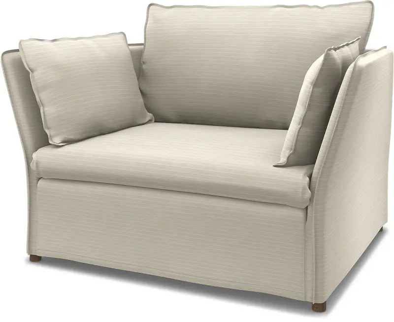 This Bemz cover fits IKEA Backsälen 1,5 seater sofa (115 cm long) and it includes 5 pieces: 1 frame cover, 1 seat cushion cover, 1 back cushion cover & 2 decorative cushion covers. The IKEA Backsälen cover is easy to put on, the frame cover is slided over the armrest and backrest of the sofa, to be pulled down över the seating area. No assembly required. Fitting Instructions: Remove the original IKEA slipcover before fitting the Bemz cover.