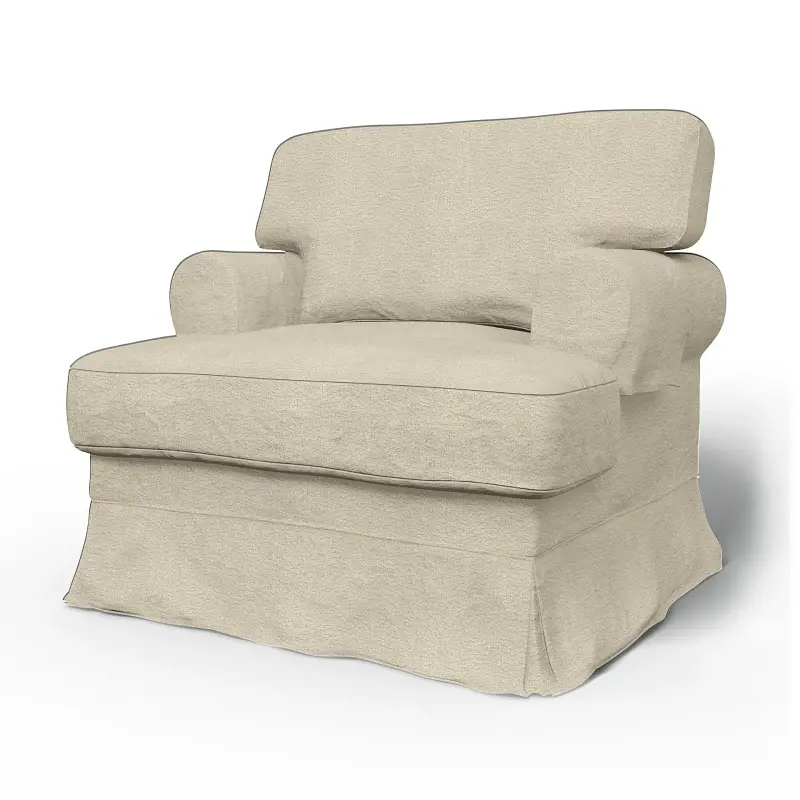 This cover includes 5 pieces: 1 frame cover, 2 armrest covers and 2 cushion covers. Bemz Loose Fit covers are designed to hang looser than our Regular Fit and have a distinctive floor-length drape. It can only be used for the IKEA Ekeskog armchair sold in 2006. The Ekeskog armchair has a width of 60 cm across the backrest. If the measurement is not the same you might have an IKEA Barkaby armchair.