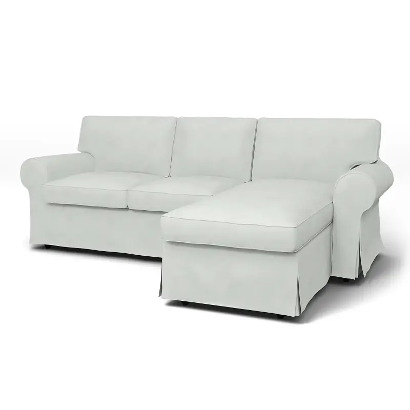 This Ektorp cover comes with piping for a classic look that resembles the original IKEA Ektorp cover. It includes 8 pieces: 1 frame cover, 3 back cushion covers, 2 seat cushion covers, 1 frame cover for the chaise longue, and 1 chaise longue cushion cover. The chaise longue can be used on the left, middle or right side. The cushion covers are closed with zippers and are reversible.