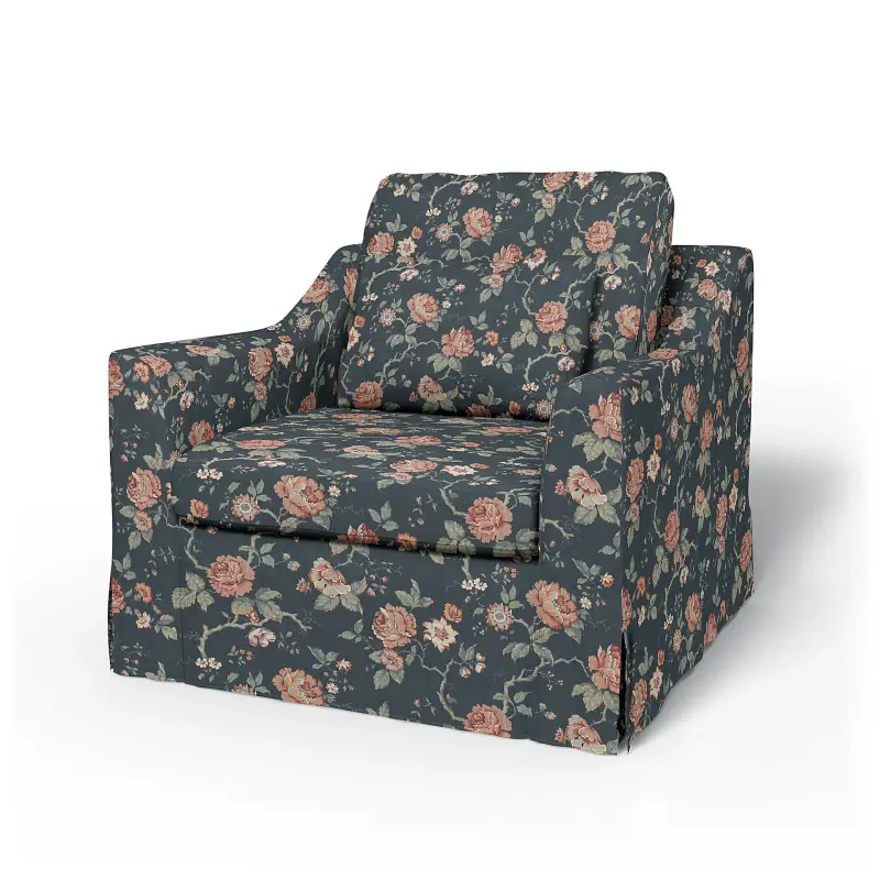This model includes 4 covers: 1 frame cover which attaches with velcro, 1 bottom seat cushion cover, 1 back cushion cover and 1 smaller lumbar cushion cover. The cushion covers close with zippers. The cover has a floor-length skirt with corner pleats. This cover can only be used on the Färlöv armchair from IKEA.