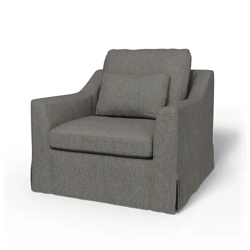 This model includes 4 covers: 1 frame cover which attaches with velcro, 1 bottom seat cushion cover, 1 back cushion cover and 1 smaller lumbar cushion cover. The cushion covers close with zippers. The cover has a floor-length skirt with corner pleats. This cover can only be used on the Färlöv armchair from IKEA.