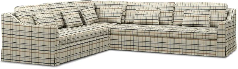 This cover includes 18 pieces: 3 frame covers, 3 seat cushion covers, 6 back cushion covers, 4 small cushion covers & 2 large cushion covers. Fitting instructions: this model needs to be disassembled before you fit your new cover. Remove the old cover first. The cushion covers close with zippers. The cover has a floor-length skirt with corner pleats. When facing the sofa, the 2-seat section is on your left. This cover will only fit the IKEA Färlöv sofa.