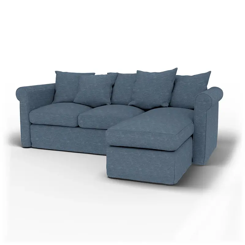 This cover is custom-made to fit the IKEA Grönlid 3 Seater Sofa with Chaise Longue. Featuring classic piped edges, it's designed to look almost exactly like the original cover. It includes 14 individual pieces: 2 back frame covers, 2 front panel covers, 2 seat cushion covers, 2 armrest covers, 5 back cushion covers, and a cover for the chaise longue. The back cushion covers are reversible. Fitting instructions: This model needs to be disassembled before you fit your new cover. Remove old cover first. The Grönlid sofa looks similar to the IKEA Ängby or Ektorp sofas, so be sure to check you've selected the right cover for your model. The Grönlid is easy to distinguish by its scatter back cushions and black rubber feet.