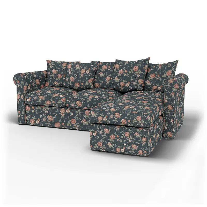This cover is custom-made to fit the IKEA Grönlid 3 Seater Sofa with Chaise Longue. Featuring classic piped edges, it's designed to look almost exactly like the original cover. It includes 14 individual pieces: 2 back frame covers, 2 front panel covers, 2 seat cushion covers, 2 armrest covers, 5 back cushion covers, and a cover for the chaise longue. The back cushion covers are reversible. Fitting instructions: This model needs to be disassembled before you fit your new cover. Remove old cover first. The Grönlid sofa looks similar to the IKEA Ängby or Ektorp sofas, so be sure to check you've selected the right cover for your model. The Grönlid is easy to distinguish by its scatter back cushions and black rubber feet.