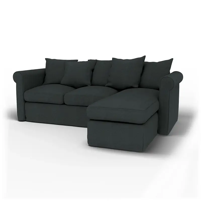 This cover is custom-made to fit the IKEA Grönlid 3 Seater Sofa with Chaise Longue. Featuring classic piped edges, it's designed to look almost exactly like the original cover. It includes 14 individual pieces: 2 back frame covers, 2 front panel covers, 2 seat cushion covers, 2 armrest covers, 5 back cushion covers, and a cover for the chaise longue. The back cushion covers are reversible. Fitting instructions: This model needs to be disassembled before you fit your new cover. Remove old cover first. The Grönlid sofa looks similar to the IKEA Ängby or Ektorp sofas, so be sure to check you've selected the right cover for your model. The Grönlid is easy to distinguish by its scatter back cushions and black rubber feet.