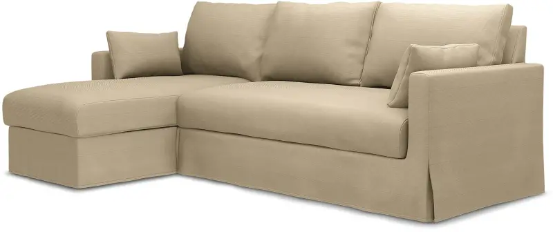 This Bemz cover fits IKEA Hyltarp 3-seater sofa with chaise longue, left (262 cm wide) and it includes 8 pieces: 1 frame cover, 3 backrest cushion covers, 1 seat cushion cover, 1 chaise longue seat cover, 2 decorative cushion covers. This cover is made in the original fit from IKEA with a long skirt. The IKEA Hyltarp cover is easy to put on, no assembly is required. Fitting instructions: Remove the original IKEA slipcover before fitting the Bemz cover.