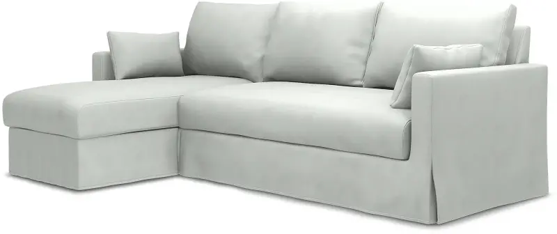 This Bemz cover fits IKEA Hyltarp 3-seater sofa with chaise longue, left (262 cm wide) and it includes 8 pieces: 1 frame cover, 3 backrest cushion covers, 1 seat cushion cover, 1 chaise longue seat cover, 2 decorative cushion covers. This cover is made in the original fit from IKEA with a long skirt. The IKEA Hyltarp cover is easy to put on, no assembly is required. Fitting instructions: Remove the original IKEA slipcover before fitting the Bemz cover.