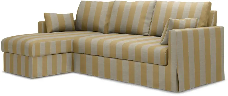 This Bemz cover fits IKEA Hyltarp 3-seater sofa with chaise longue, left (262 cm wide) and it includes 8 pieces: 1 frame cover, 3 backrest cushion covers, 1 seat cushion cover, 1 chaise longue seat cover, 2 decorative cushion covers. This cover is made in the original fit from IKEA with a long skirt. The IKEA Hyltarp cover is easy to put on, no assembly is required. Fitting instructions: Remove the original IKEA slipcover before fitting the Bemz cover.