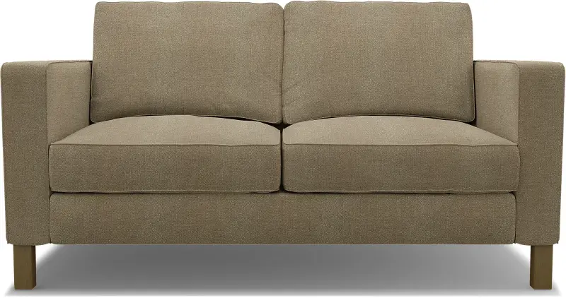 This cover includes 7 pieces: 1 frame cover, 2 armrest covers, 2 seat cushion covers and 2 backrest covers. It can only be used on the IKEA Karlstad 2 seater sofa (165 cm wide). If your sofa is bigger, see the IKEA Karlstad 3 seater sofa. If you can pull a bed out of your sofa, see the Karlstad sofa bed. This cover cannot be used on leather sofas. The cushion covers are reversible and secured with zippers. Assembly required.