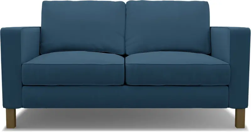 This cover includes 7 pieces: 1 frame cover, 2 armrest covers, 2 seat cushion covers and 2 backrest covers. It can only be used on the IKEA Karlstad 2 seater sofa (165 cm wide). If your sofa is bigger, see the IKEA Karlstad 3 seater sofa. If you can pull a bed out of your sofa, see the Karlstad sofa bed. This cover cannot be used on leather sofas. The cushion covers are reversible and secured with zippers. Assembly required.