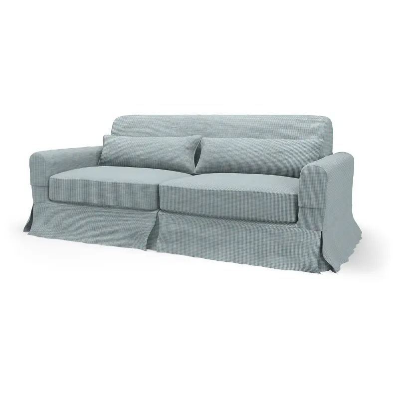 This cover includes 5 pieces: 1 frame cover, 2 seat cushion covers and 2 decorative cushions. It will only fit the discontinued IKEA Nikkala 3 seater sofa sold from 1998-2006. Bemz Loose Fit covers are designed to hang looser than our Regular Fit and have a distinctive floor-length drape. Lovely ties are used instead of zippers.