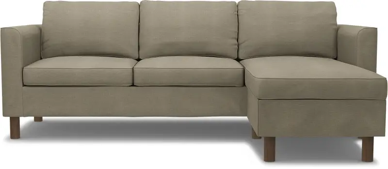 This Bemz cover fits the IKEA Pärup 3-seat sofa with chaise longue (235 cm long). It’s a 7-piece custom cover that includes: 1 sofa frame cover, 3 back cushion covers, 2 seat cushion covers, and 1 chaise longue cover. The cover is easy to put on with no assembly required. The sofa frame cover slides over the armrest and backrest and is pulled down over the seating area. Fitting instructions: Remove the original IKEA slipcover before fitting the custom-made Bemz cover.