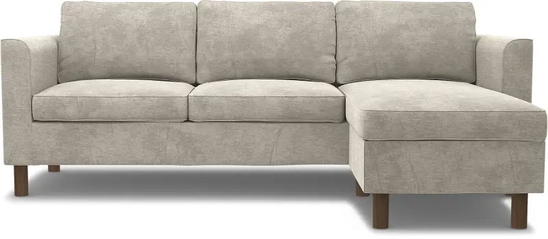 This Bemz cover fits the IKEA Pärup 3-seat sofa with chaise longue (235 cm long). It’s a 7-piece custom cover that includes: 1 sofa frame cover, 3 back cushion covers, 2 seat cushion covers, and 1 chaise longue cover. The cover is easy to put on with no assembly required. The sofa frame cover slides over the armrest and backrest and is pulled down over the seating area. Fitting instructions: Remove the original IKEA slipcover before fitting the custom-made Bemz cover.