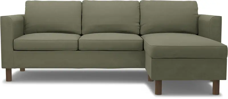 This Bemz cover fits the IKEA Pärup 3-seat sofa with chaise longue (235 cm long). It’s a 7-piece custom cover that includes: 1 sofa frame cover, 3 back cushion covers, 2 seat cushion covers, and 1 chaise longue cover. The cover is easy to put on with no assembly required. The sofa frame cover slides over the armrest and backrest and is pulled down over the seating area. Fitting instructions: Remove the original IKEA slipcover before fitting the custom-made Bemz cover.