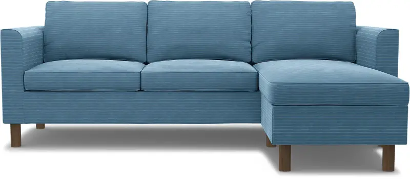 This Bemz cover fits the IKEA Pärup 3-seat sofa with chaise longue (235 cm long). It’s a 7-piece custom cover that includes: 1 sofa frame cover, 3 back cushion covers, 2 seat cushion covers, and 1 chaise longue cover. The cover is easy to put on with no assembly required. The sofa frame cover slides over the armrest and backrest and is pulled down over the seating area. Fitting instructions: Remove the original IKEA slipcover before fitting the custom-made Bemz cover.
