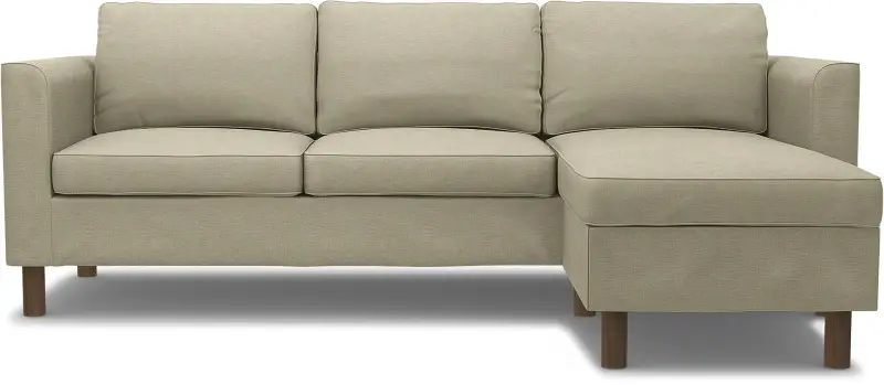 This Bemz cover fits the IKEA Pärup 3-seat sofa with chaise longue (235 cm long). It’s a 7-piece custom cover that includes: 1 sofa frame cover, 3 back cushion covers, 2 seat cushion covers, and 1 chaise longue cover. The cover is easy to put on with no assembly required. The sofa frame cover slides over the armrest and backrest and is pulled down over the seating area. Fitting instructions: Remove the original IKEA slipcover before fitting the custom-made Bemz cover.