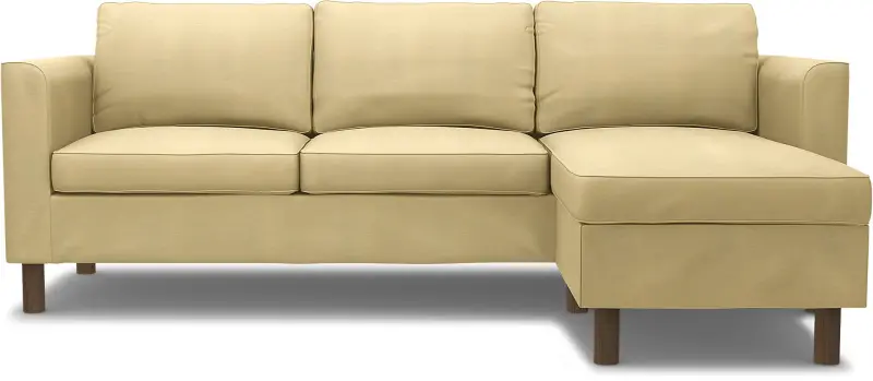 This Bemz cover fits the IKEA Pärup 3-seat sofa with chaise longue (235 cm long). It’s a 7-piece custom cover that includes: 1 sofa frame cover, 3 back cushion covers, 2 seat cushion covers, and 1 chaise longue cover. The cover is easy to put on with no assembly required. The sofa frame cover slides over the armrest and backrest and is pulled down over the seating area. Fitting instructions: Remove the original IKEA slipcover before fitting the custom-made Bemz cover.