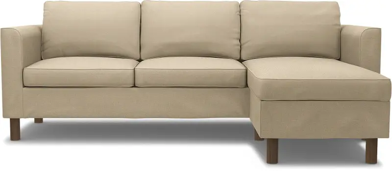 This Bemz cover fits the IKEA Pärup 3-seat sofa with chaise longue (235 cm long). It’s a 7-piece custom cover that includes: 1 sofa frame cover, 3 back cushion covers, 2 seat cushion covers, and 1 chaise longue cover. The cover is easy to put on with no assembly required. The sofa frame cover slides over the armrest and backrest and is pulled down over the seating area. Fitting instructions: Remove the original IKEA slipcover before fitting the custom-made Bemz cover.