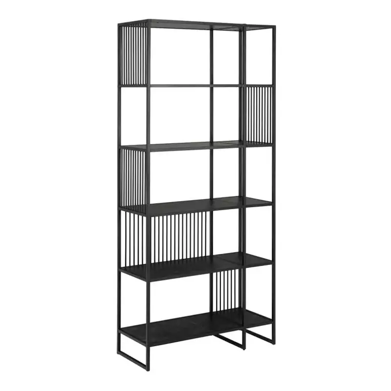 Update your space with this sleek bookcase, which offers a matte black steel frame and base, complemented by five shelves in a rough matt black finish. Its contemporary design is perfect for organizing and displaying your favorite books and decor. Features: Modern bookcase offering ample storage Featuring 5 shelves adorned with a black marble look Sturdy black rough powder coated steel frame ensures stability Vertical round wires for visual interest Designed by our in-house designer Lasse Cha Pedersen and exclusively protected for Actona Specifications: Dimensions: H:185.0 x W:85.0 x D:35.0 cm Colour: Black Guarantee:1 year Material: Shelf Melamine Matt Black Izmir Rough / Frame Steel Matt Black Rough Powder Coated Model Number: 90A0000104668