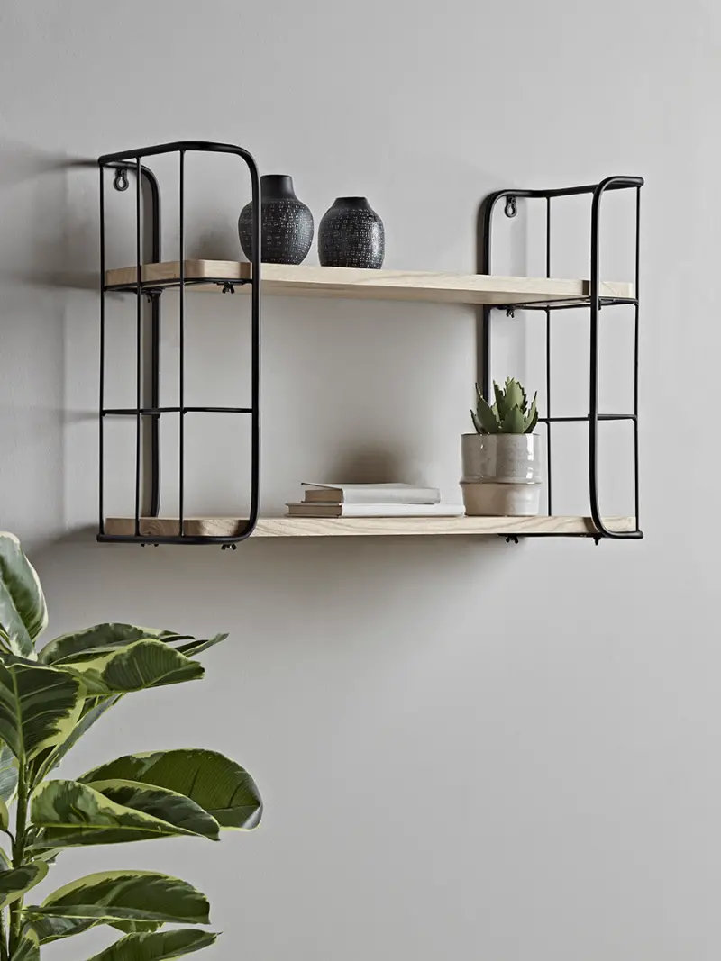 Designed to create an industrial look in your living space, our small shelf unit has two handy wooden shelves and a black metal frame that curves around the edges.This shelf unit can be placed on any wall in your home to store and display your favourite items.