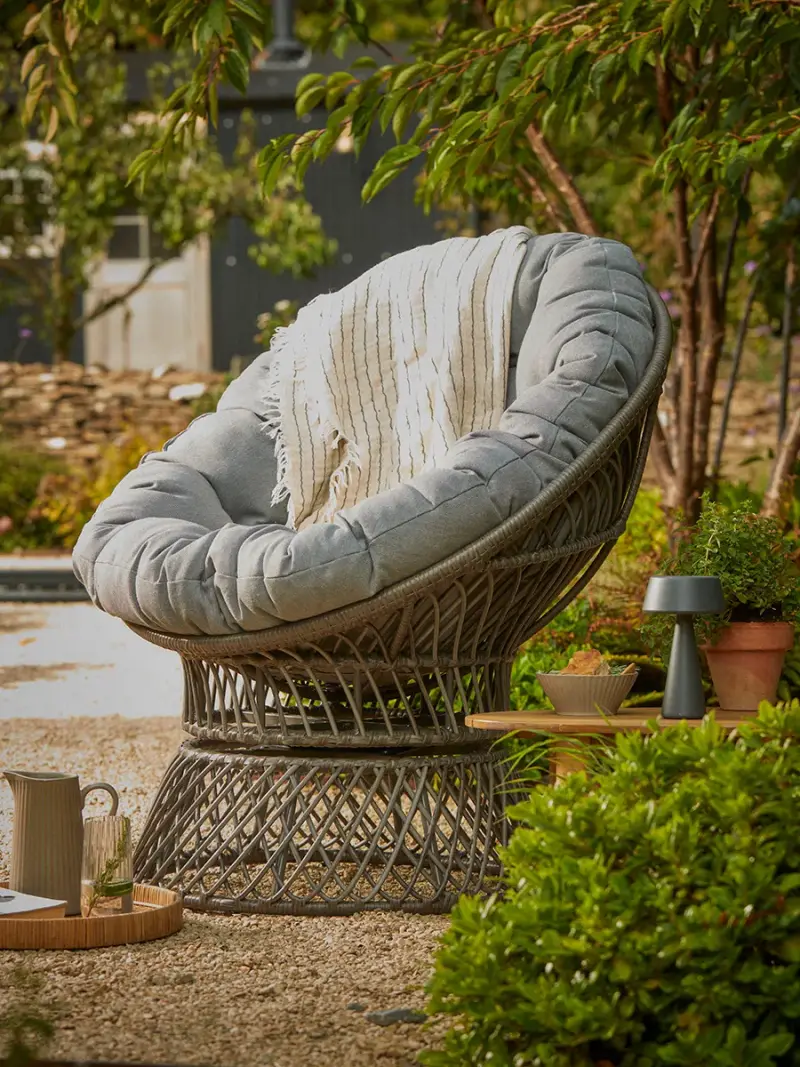 Bring an effortlessly contemporary bohemian vibe to a corner of the garden or balcony this season with our statement Issuri Swivel Chair.In a diamond patterned faux wicker weave, the grey tone brings a sophisticated edge to the fun rounded shape of this stylish outdoor chair. A sumptuous cushion offers cosy all-round support and the swivel action will allow you to turn in or away from the sun as you choose. This seat is sure to become your favourite place to relax this season.Click here to view our useful Outdoor Furniture Buying Guide.Click here for our outdoor furniture care guide.