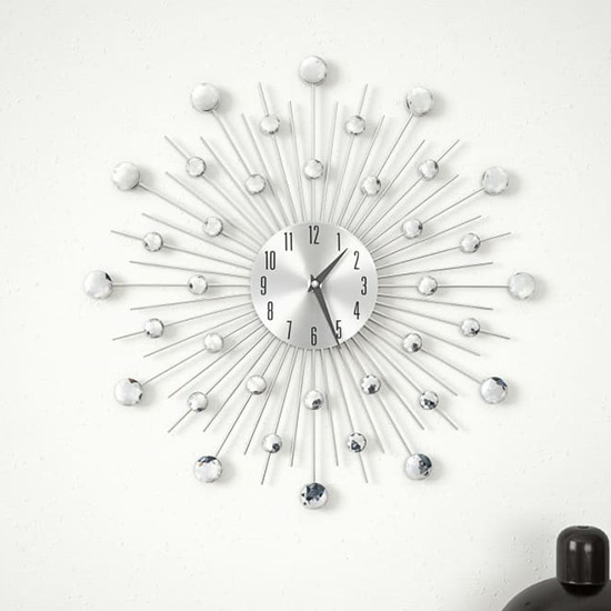 Itotia Round Quartz Movement Wall Clock In Silver, Our wall clock will make a great addition to your room decor! FEATURES : Material : Aluminium Frame, Acrylic Beads Finish : Silver The clock has a sturdy aluminium frame and is highly durable It features a beautiful scattering design dotted with shiny beads which add to the clock's elegant style. Equipped with high-quality quartz movements, the clock is highly accurate at keeping time Thanks to the clear numerals, the clock can be read clearly even over long distances It can be easily hung onto the wall The clock will give a neat and tidy look to your interior Requires 1 AA battery (not included) Available at an affordable price Images shown are for illustration purpose only DIMENSIONS : Diameter : 50cm