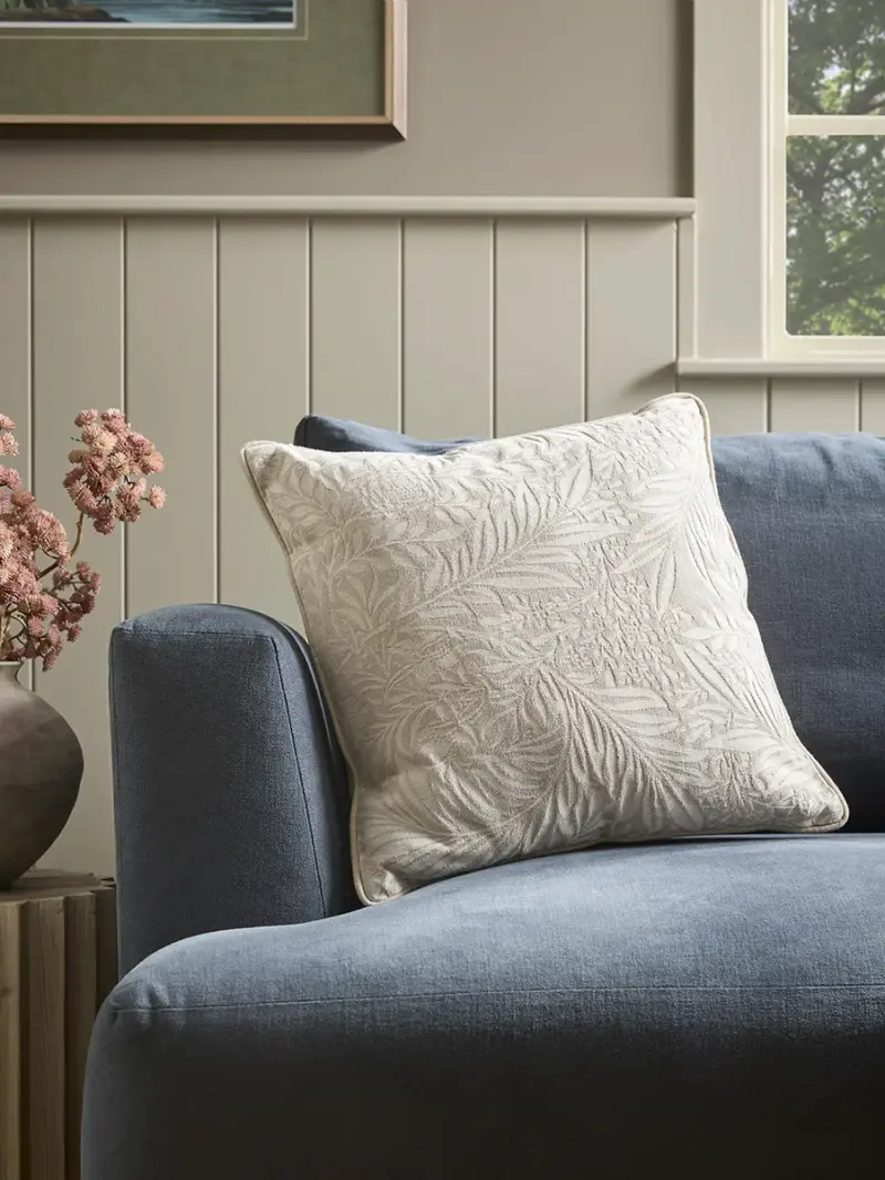 A pattern of intertwined leaves lends a beautiful texture to this soft cream cushion.Featuring a neat piped edge, its neutral tone makes it a versatile addition to any setting.