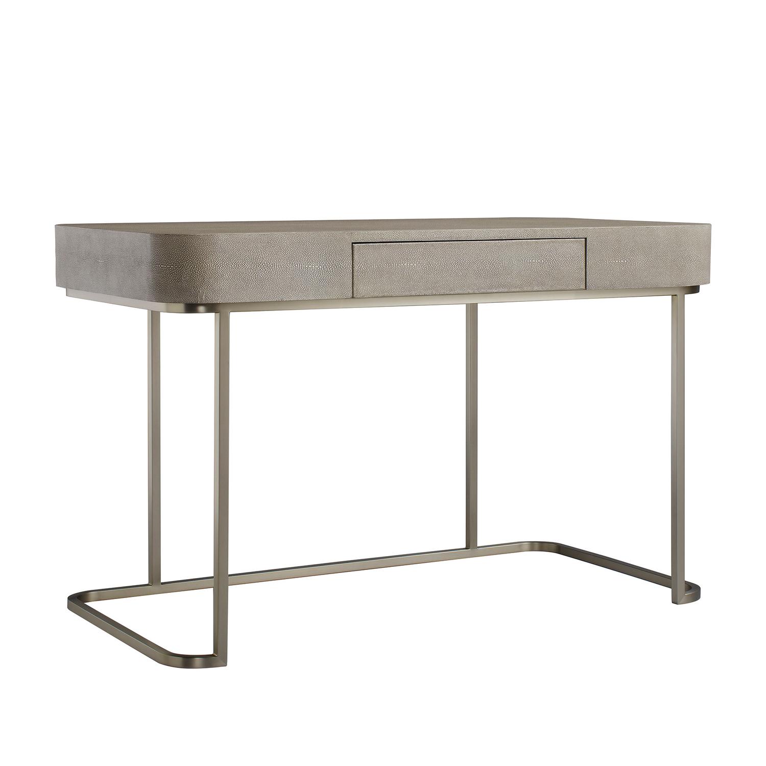 A distinctive writing desk with subtle Art Deco features. A sculptural stainless steel frame supports a top with two rounded front corners finished in elegant dove grey faux shagreen, with a neat pencil drawer fitting into the sleek profile of this piece. Due to the nature of shagreen the colouring may vary slightly from one piece to another, adding to the natural beauty of the product. Jacques Desk Grey, Desk, Dove Grey - Andrew Martin