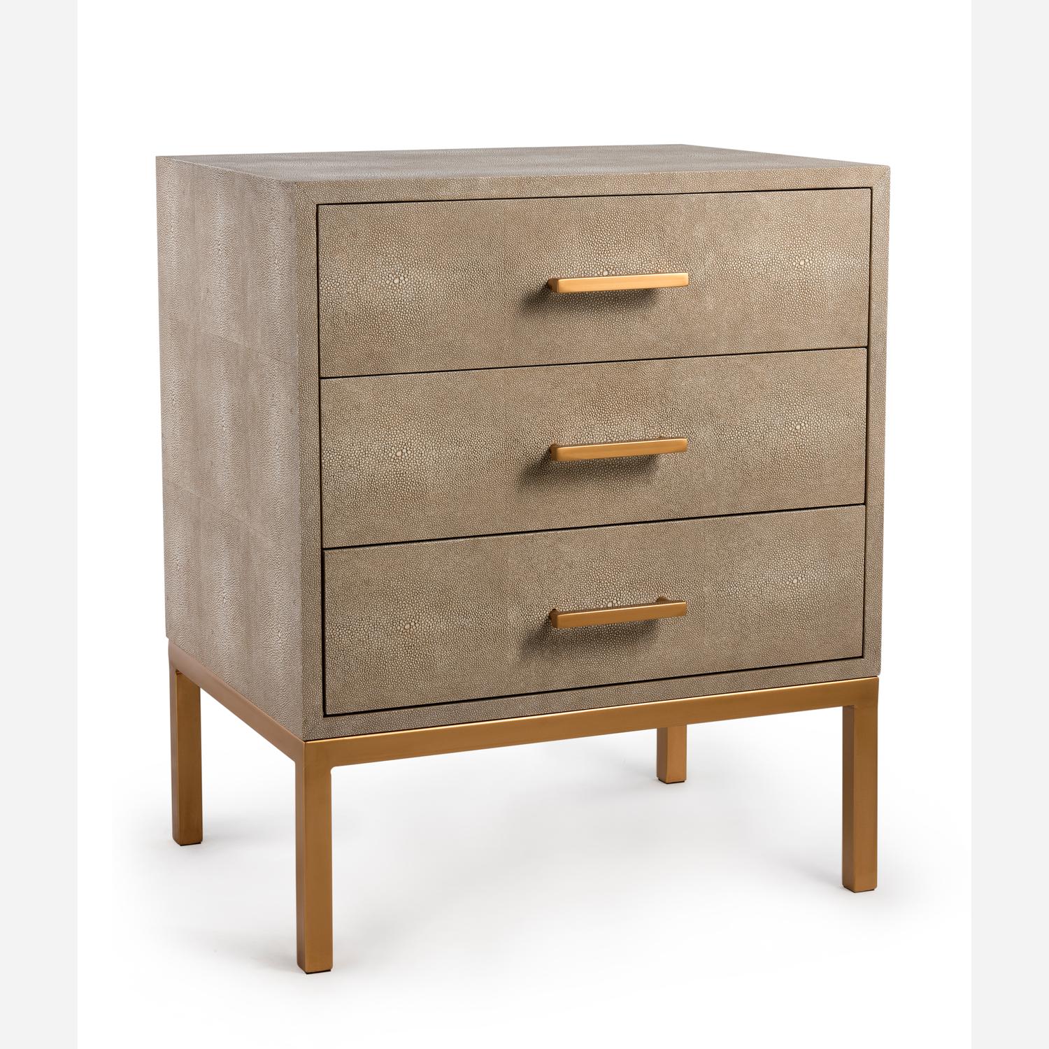 Luxury designer bedside table in cream faux shagreen finish with slim legs and handles in a matt gold finish. Jasper Bedside Table Cream, Side Chest, Cream - Andrew Martin