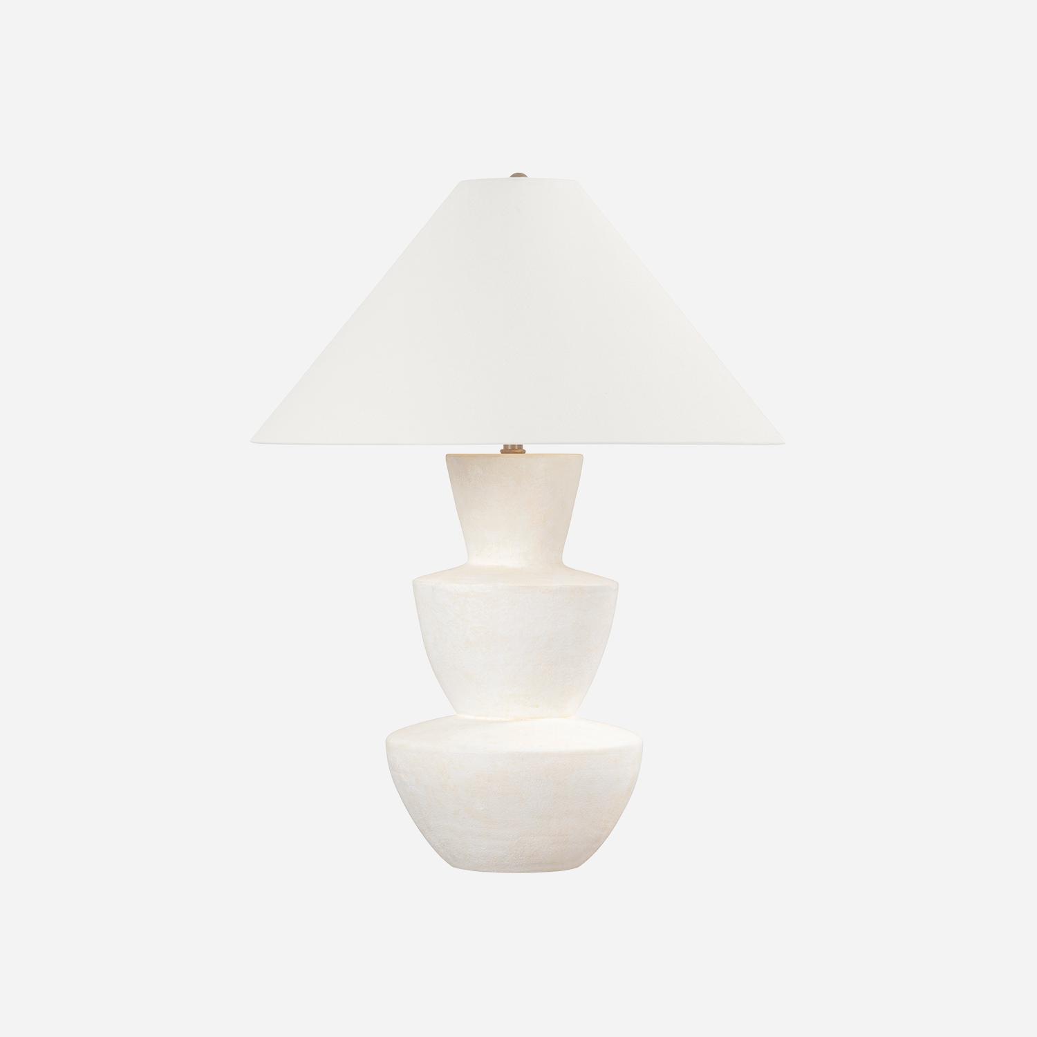 Sculptural yet soft, the Kamas Table Lamp in Ceramic Ivory features organic ceramic forms, a linen shade and Patina Brass accents. Warm, modern lighting. Kamas Table Lamp, Light, White - Andrew Martin