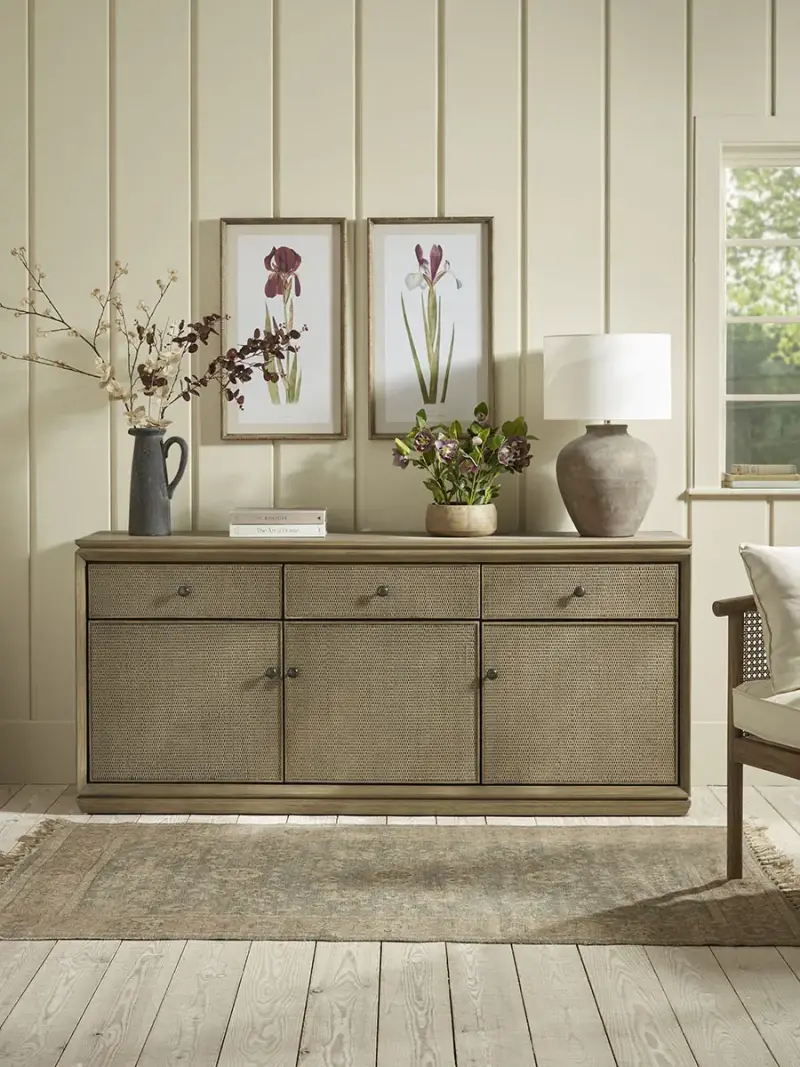 A simple, dark-toned wood frame brings as much style as it does practicality to your living space.Three drawers sit on top of the cupboard, which is fronted with a wicker rattan, creating a unique and laid-back look that welcomes a homely feeling and warms your space.Finished with darker handles, this sideboard sits wonderfully in our English Rustic trend.