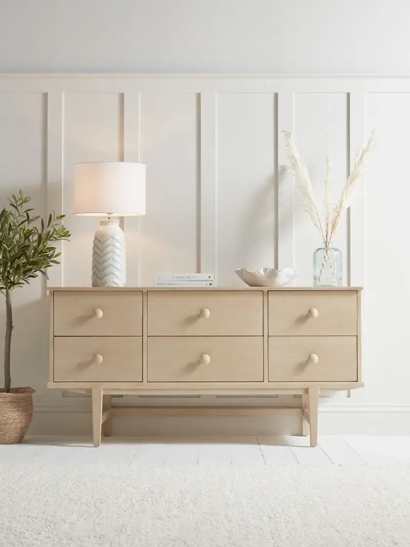 Katara is a sideboard inspired by the best of Scandinavian design.Pale blonde natural wood and simple outlines make for an elegant and functional piece that will sit well in neutral room schemes.The oak sideboard has six drawers with button knobs in the same wood and stands on slim tapered legs. The middle drawers are wider than the outer drawers which offers a pleasing profile.