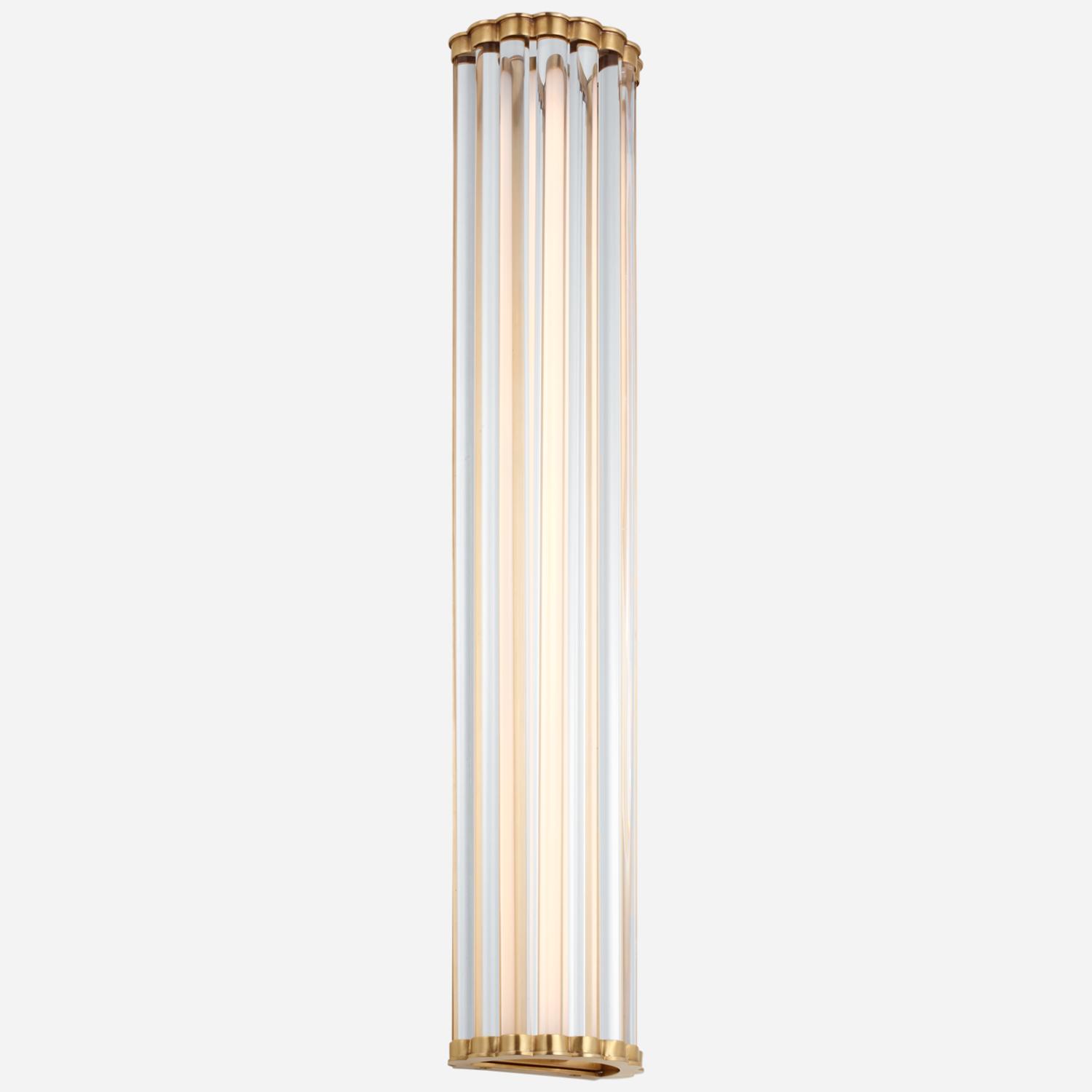 Kean sconce in brass with clear glass rods This sleek wall sconce extends from a rectangular wall plate, housing an LED lamp beneath a series of clear glass rods. The metal caps at each end feature curved accents for a vintage-inspired look. Kean is perfect for flanking a mirror or providing evenly diffused light in any space. Kean Wall Light Brass, Wall Light, Large, Antique-Burnished Brass - Andrew Martin