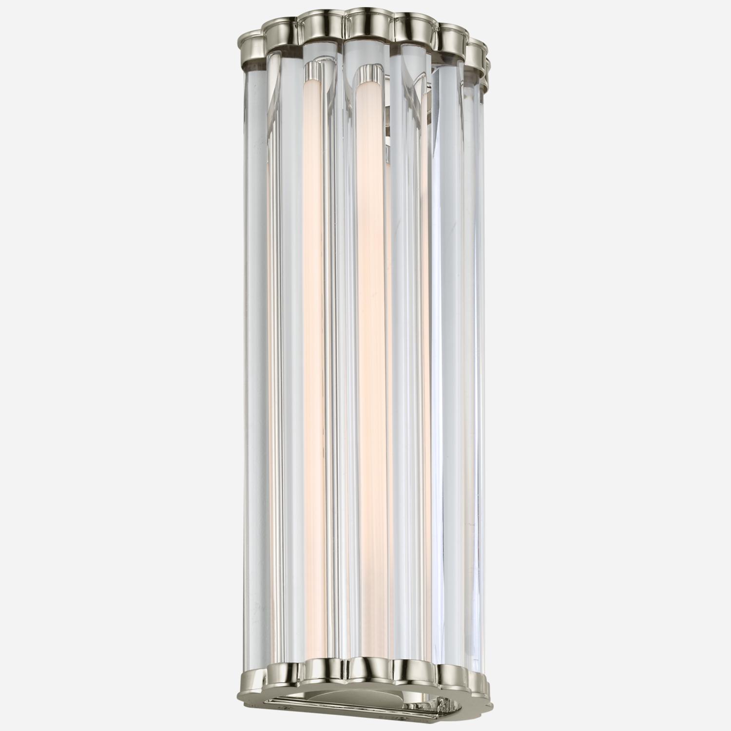 This sleek wall sconce extends from a rectangular wall plate, housing an LED lamp beneath a series of clear glass rods. The metal caps at each end feature curved accents for a vintage-inspired look. Kean Wall Light Nickel, Wall Light, Small, Polished Nickel / Clear Glass - Andrew Martin