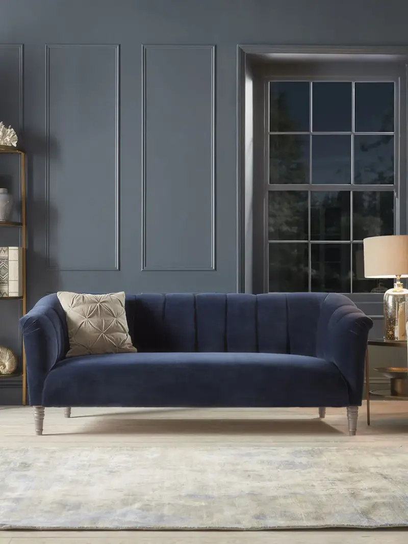 Deep vertical channels create a sculpted feminine outline across our Kemi range which will bring a sophisticated touch of old school glamour to your living space. An elegant slope from back to arm tip, hand pleated finishing and turned polished legs add engaging refinement The sofa, available in both two seater and three seater sizes has a form fitted back and sleek single seat cushion which retains its shape even after prolonged lounging sessions. Pictured here in our Navy Velvet, our Kemi collection can be upholstered in a choice of 34 distinctive shades and six fabrics to suit your style. Read our Upholstery FAQs View our full Upholstery Terms and Conditions