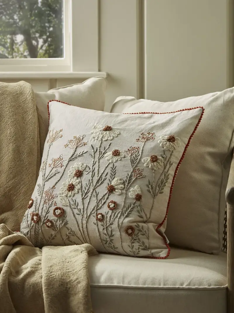Delicately embroidered flowers sit on a neutral cushion, creating a beautiful, blossoming scene.Finished with an orange pom-pom detailing, warming tones of sage, cream and terracotta work to create beautiful wildflowers that add a gentle pop of colour in your home.
