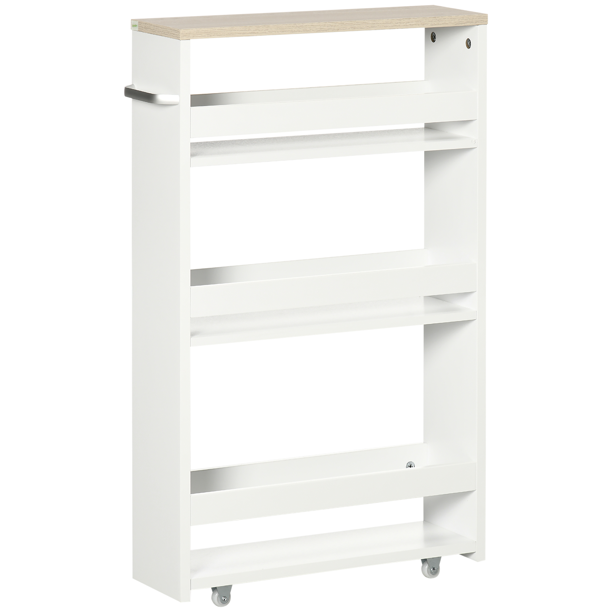 This versatile kleankin storage cart and bathroom trolley is designed to fit seamlessly into any modern bathroom. Equipped with wheels and a side handle for easy mobility, its stable construction features white particleboard complemented by a Silver Tone handle. Suitable for bathroom essentials, it also makes a handy addition to your kitchen.Features:Bathroom caddy freestanding with three shelves for bathroom accessories: shampoo, toilet paper, etc.Four wheels and a handle for effortless movementCompact design of slim storage trolley is suitable for small spaces, such as between the toilet and bathtubLaminated surface is easy to clean and moisture-resistant, suits for bathroom useSleek lines and a simple look blend easily into any roomSide handle for pushing or pulling the unit into placeAssembly required