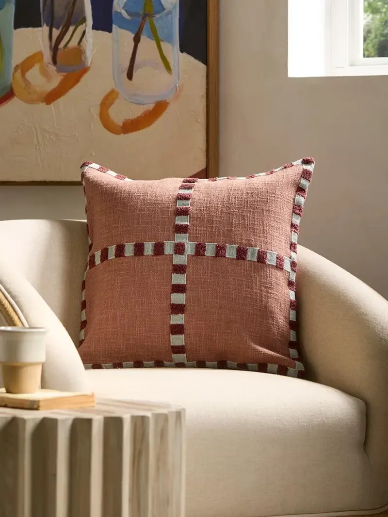 This intricately detailed cushion cover is crafted from 100% cotton. Its terracotta base features a richly textured woven finish, complemented by contrasting bands of tufted darker red and cream braiding that elegantly quarter and border the square design. This cushion cover is suitable for a 50cm x 50cm cushion pad which is available separately.