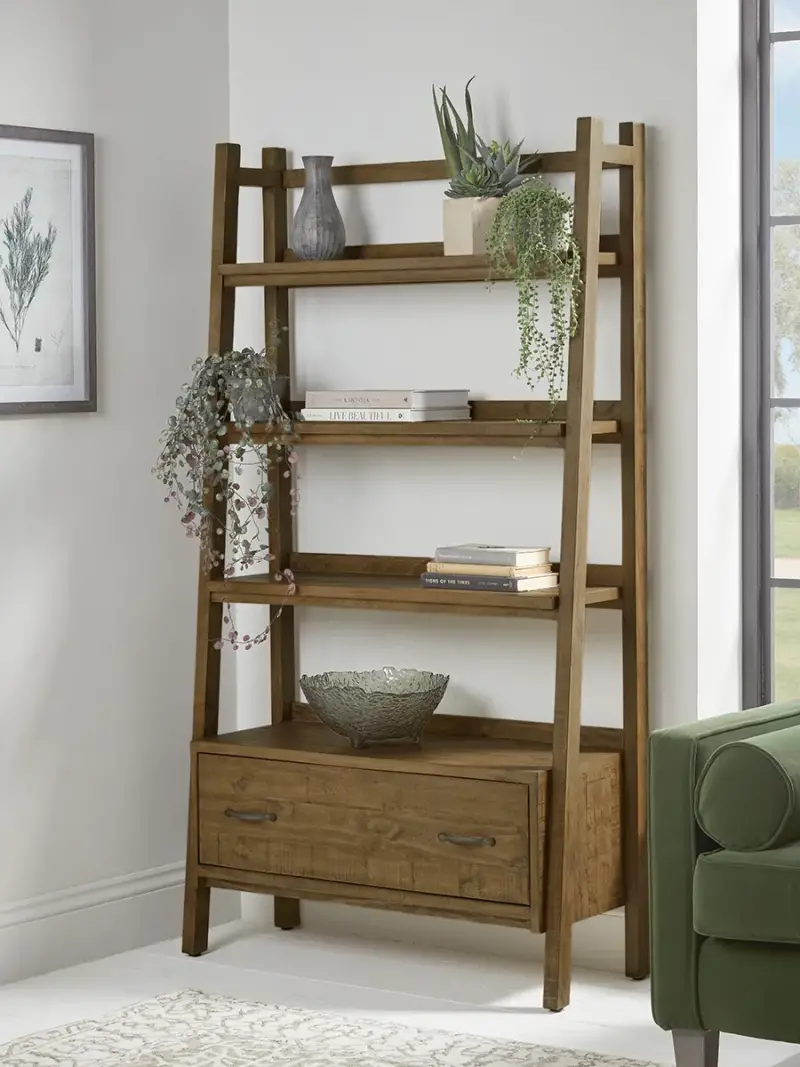Three shelves sit above a drawer in this ladder style shelf unit, perfect for styling your favourite ornaments as well as keeping clutter at bay. Made from a natural wood, the unique patina creates a rustic feeling, making this unit ideal for a more industrial style.