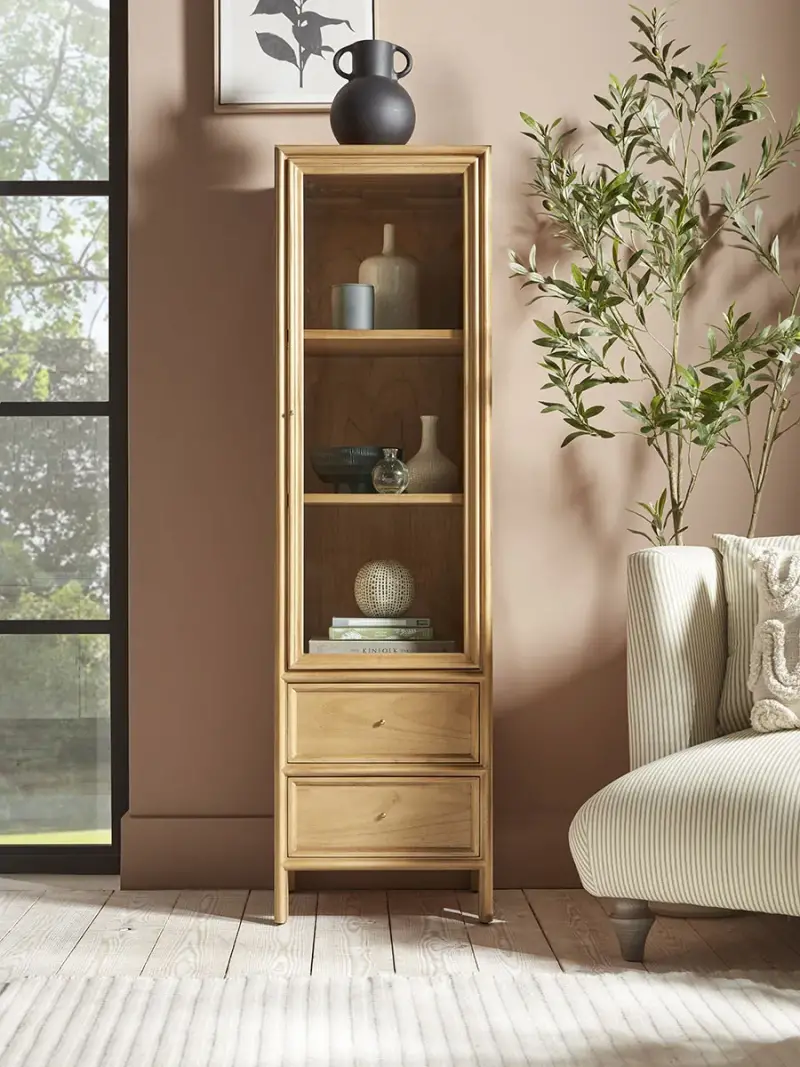 Perfect for tall and narrow spaces, our Lana Display Cabinet is crafted from a light toned plywood to give a warming and spacious feeling.Behind a glass door, three shelves give perfect space for housing your favourite accessories, whilst two bottom drawers are ideal for keeping bits and bobs hidden away.Finished with tiny circular gold toned handles, the neutrality of this shelving unit means it works well in a variety of interior schemes.