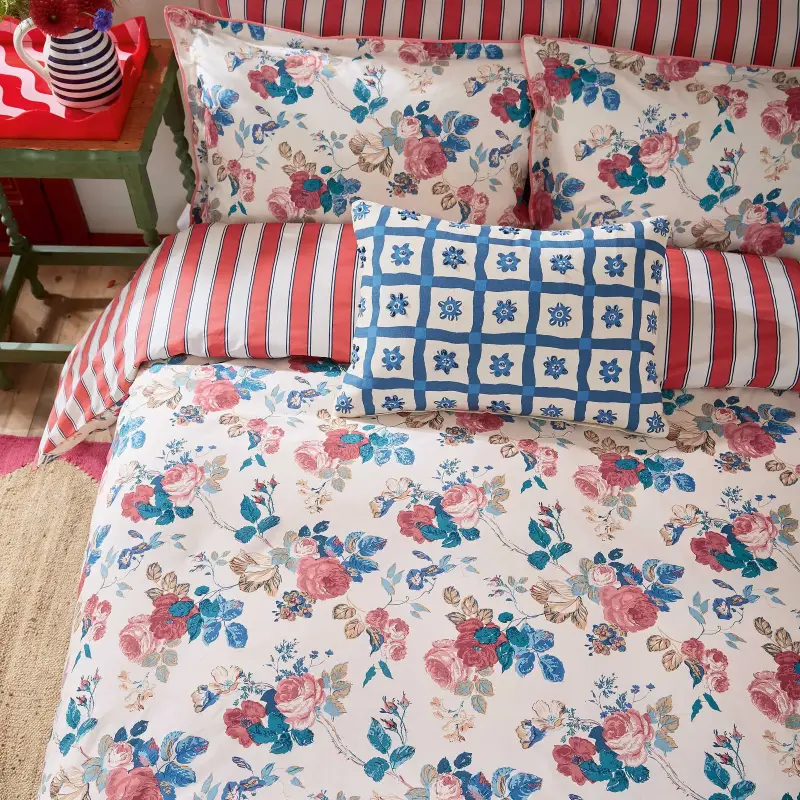 Alec Single Duvet Cover SET Blue/Red This print exudes a romantic, vintage charm, with soft velvety roses in pink and red tones trailing gracefully across the bedlinen. The reverse side features a bold stripe design, offering a striking contrast. The Oxford pillowcases are beautifully finished with delicate pink piping. Complete the bed with the stiped standard pillowcase pairs and the Sora cushion, featuring a charming grid design filled with tiny flowers—each delicately accented with embroidered French knots. Includes 1 Single Pillowcase