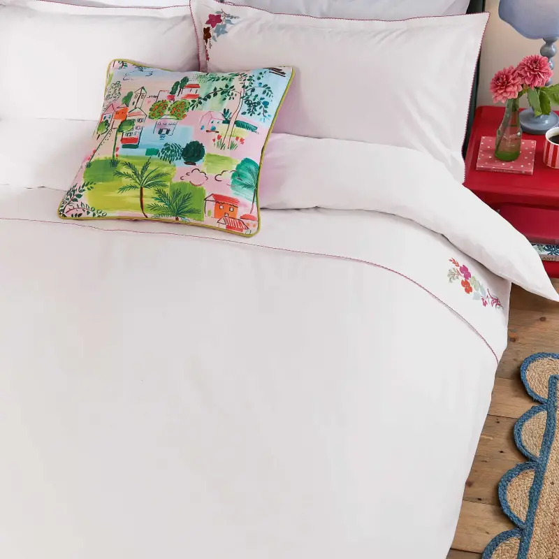 Fia Single Duvet Cover SET Multi Fia’s smooth white cotton bedding is delicately finished with a charming pink embroidered shell edge. A graceful floral sprig design adds a touch of timeless elegance to the duvet cover and pillowcase corners. Complete the look with the Rudie cushion, bringing a vibrant splash of summer colour to your bed. Includes 1 Single Pillowcase