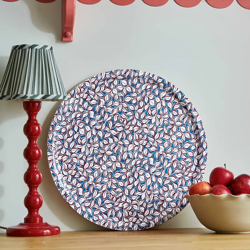 Leaf Tray Blue/Red A digitally printed dotty leaf pattern tray in blue and red. The tray has a melamine front with a birch veneer to the reverse. Handmade in Sweden on the Island of Oland. FSC certified.