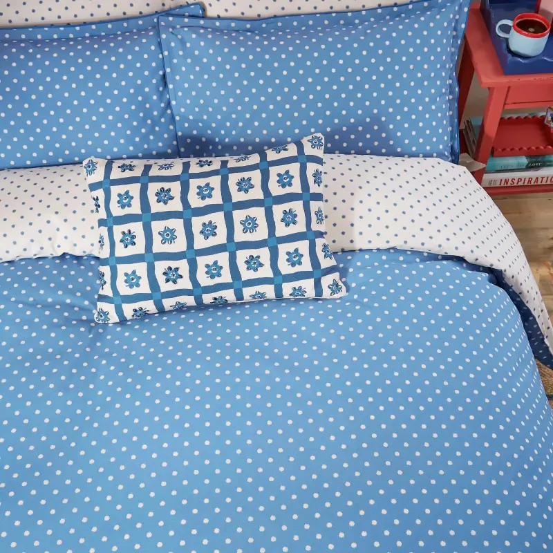 Sora Single Duvet Cover SET Blue Sora offers the perfect way to add a subtle pattern update to your bedroom, featuring a delicate print of tiny floral spots. The design reverses on the back, showcasing the same motif in an inverted colourway for a stylish contrast. Complete the look with the Sora cushion, with its delicate embroidered French knot detailing. Includes 1 Single Pillowcase