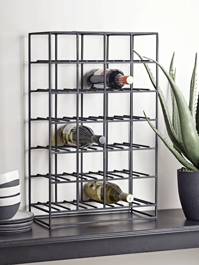 Crafted from black iron in a simplistic rectangular shape, our industrial-inspired wine rack can fit up to 24 standard sized wine bottles. Free standing, with a sturdy frame, this elegant piece will look wonderful on your kitchen surface or tucked away under the counter.
