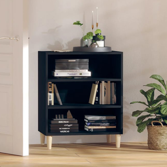 Larya Wooden Bookcase With 3 Shelves In Black, This bookcase will make a great addition to your living space. FEATURES : Material : Chipboard, Solid Eucalyptus Wood Finish : Black, Oak This bookcase is made of board, which ensures its sturdiness, durability and long-lasting service The wooden legs also add extra stability This bookcase features 3 shelves, providing ample storage space The sturdy tabletop is ideal for displaying decorative objects, photo frames or potted plants Additionally, the storage cabinet is easy to clean with a damp cloth Manual assembly is required Available at an affordable price Images shown are for illustration purpose only DIMENSIONS : Height : 70cm Width : 57cm Depth : 35cm