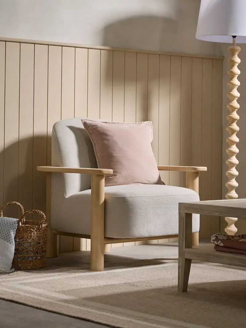 Bring understated comfort to your living space with our Leyla armchair. A curved frame with rounded legs is crafted from a blonde ash and plywood frame, complementing the neutral upholstery beautifully. With a high back and plump foam-filled padding, this armchair brings comfort to your home.