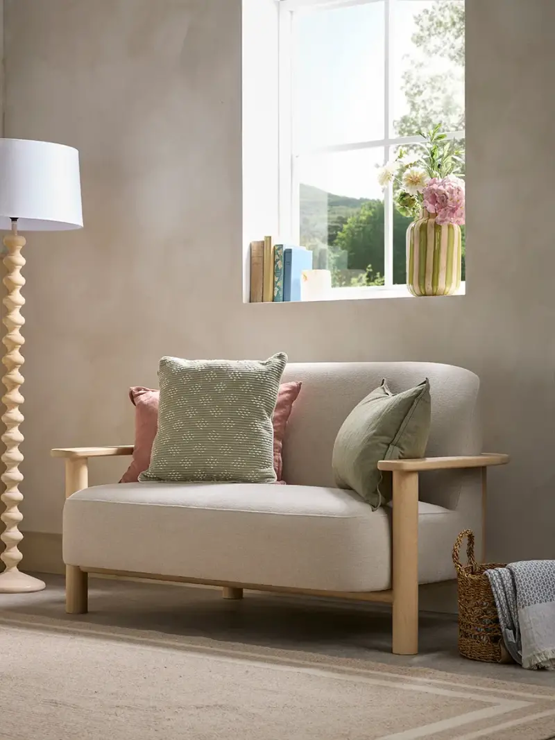 Bring contemporary style to your living space with our Leyla sofa. A blonde ash and plywood frame features a modern silhouette, with a curved backrest and rounded legs that beautifully complement the neutral upholstery. With a high back and plump foam-filled padding, this sofa brings comfort to your home.