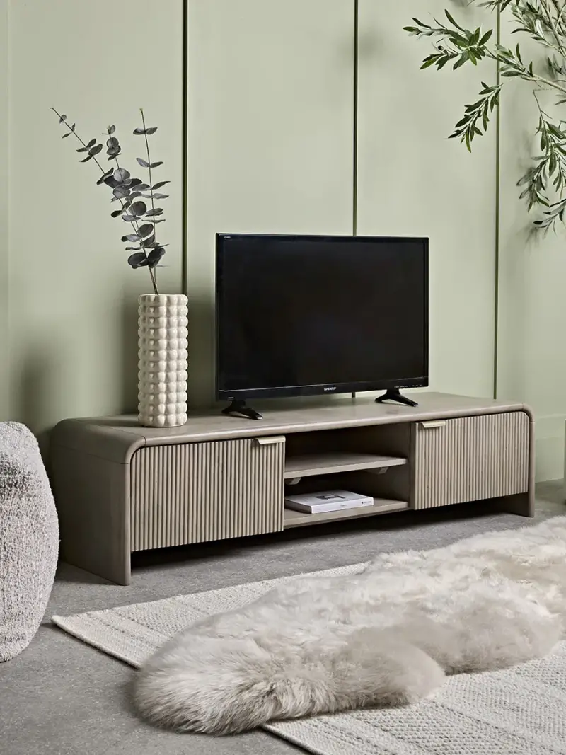 Gently defined by a soft and curvaceous frame, our Lija media unit provides simple elegance to any living space.With two cupboards that have a ribbed effect and are finished with luxe, brass handles, they give space to hide wires, controls, or anything that you don't want on show, whilst the open shelves offer space to present coffee table books, everyday reads, or your favourite accessories.