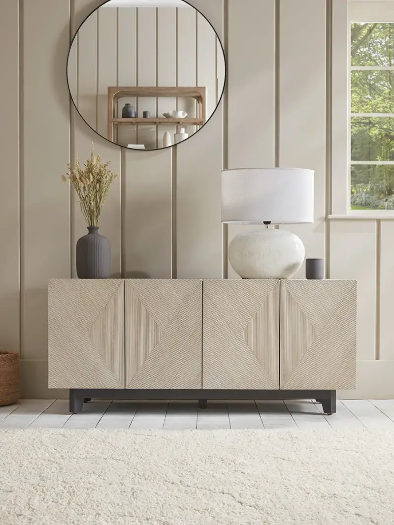 Add a touch of modern lightness to your space with our Lijia media unit. The blonde wood contrasts beautifully with the chic dark painted wooden legs, giving the unit a contemporary feeling. In a triangular shape, three sections on each door have finely carved wooden lines which create much textural dimensions and depth. Four doors with a shelving unit inside provide ample storage space, and the neutral tones lend itself to multiple interior schemes. Pair with our Lara vase, to complement the darker legs, as we have done here.